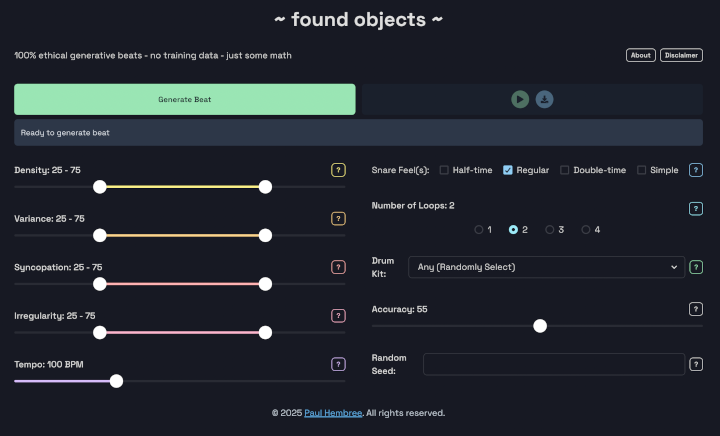 This tool generates beats using a combination of Euclidean rhythms and substitution systems for ornamentation. The ranges and metric placements of Euclidean rhythms are hand-curated to best fit a variety of musical styles.